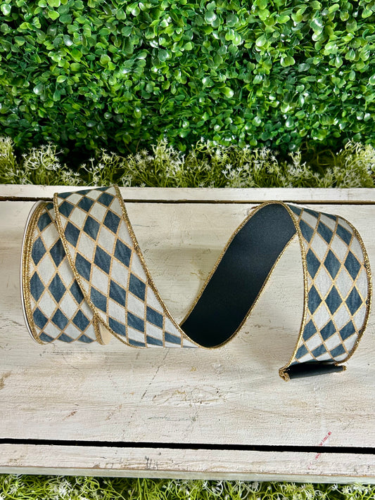 2.5 Inch By 10 Yard Cream Grey Gold And Black Antique Harlequin Fused Ribbon