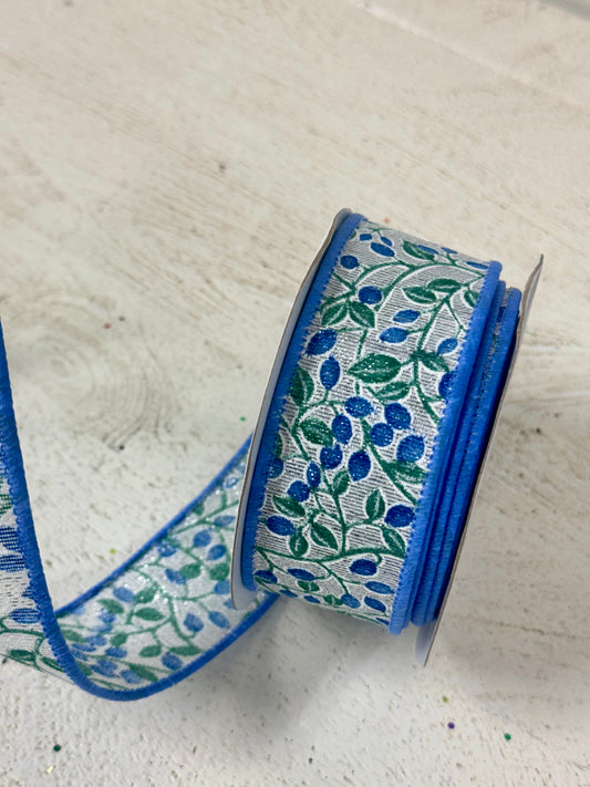 1.5 Inch By 10 Yard Blue Green Silver Mini Berries On Vine Ribbon
