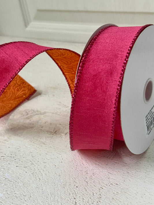 1.5 Inch By 10 Yard Double Sided Fuchsia Dupioni And Orange Glitter Embossed Ribbon