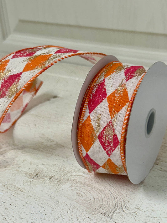 1.5 Inch By 10 Yard Cream Background Orange And Fuchsia Faded Harlequin Gold Metallic Ribbon