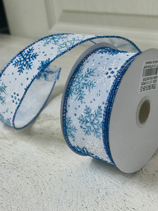 1.5 Inch By 10 Yards White Linen With Blue Glitter And White Matte Snowflakes Ribbon