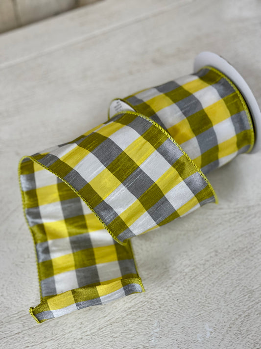 4 Inch By 10 Yard Yellow Gray And White Check Dupioni Ribbon