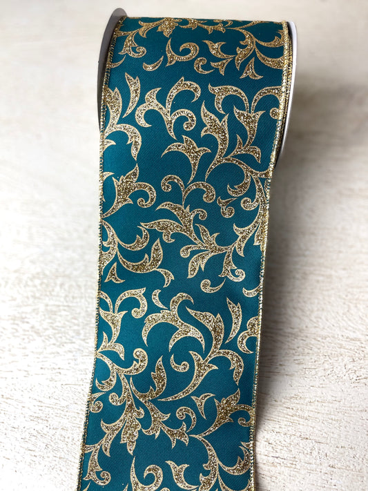 4 Inch By 10 Yard Teal Background With Gold Acanthus Leaf Ribbon