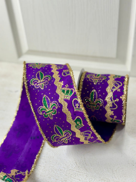 4 Inch By 10 Yard 3 In 1 Glittered Fleur De Lis Ribbon