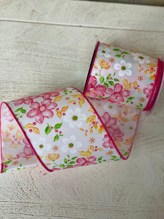 4 Inch By 10 Yard White Background With Watercolor Flowers Ribbon