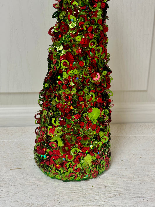 12 Inch Lime And Red Sequin Glitter Cone Tree