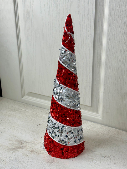 15.75 Inch Red And White Sequin Swirl Cone Tree