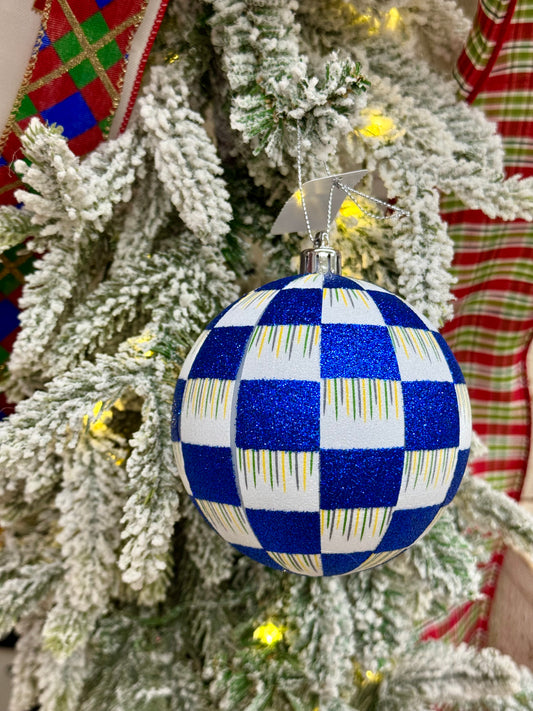 4 Inch Blue And White Glitter Check Ornament