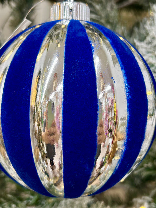 5 Inch Blue And Silver Stripe Ball Ornament