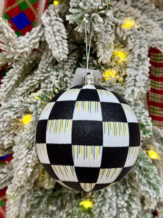 4 Inch Black And White Check Glitter Ornament