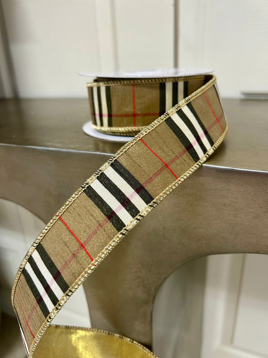 1.5 Inch By 10 Yard Burberry Check With Gold Lame Ribbon