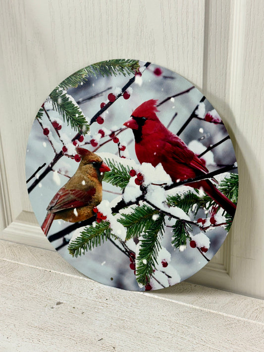 12 Inch Cardinals On Snowy Branch Metal Round Sign