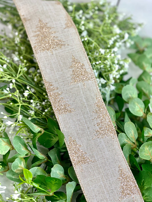 Natural Wired Ribbon With Champagne Glittered Trees 2.5 Inch