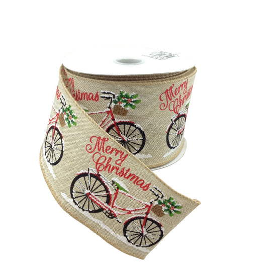 Light Natural Linen Ribbon With Christmas Bicycle 2.5 Inch 10 Yard Roll