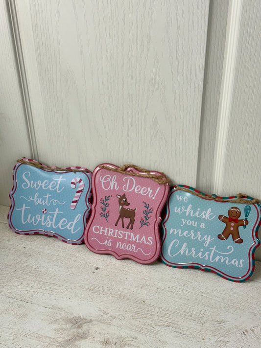 7 Inch Blue Light Pink Red Baking Metal Christmas Signs Three Assorted