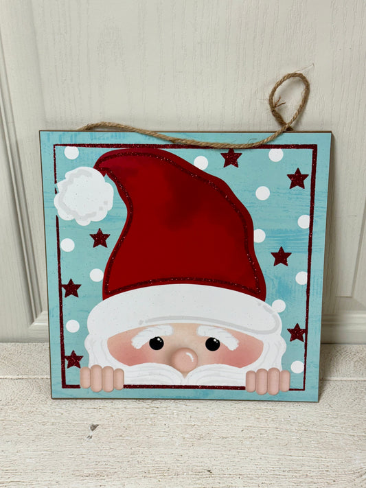 10 Inch Light Blue And Red Peeking Santa Face Square Wooden Sign