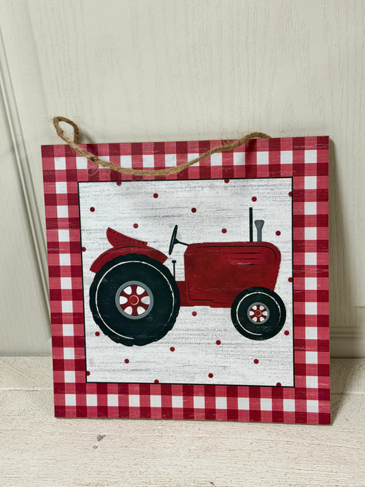 12 Inch Red Gingham Tractor Square Wooden Sign