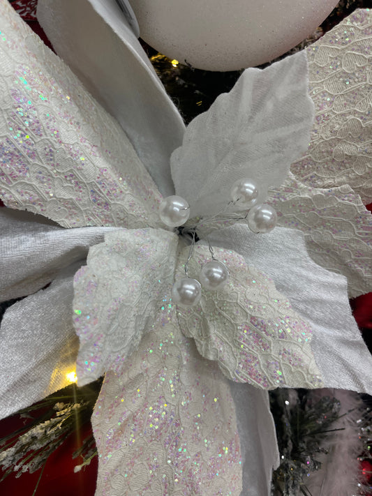 White Velvet Glitter Patterned Poinsettia Spray