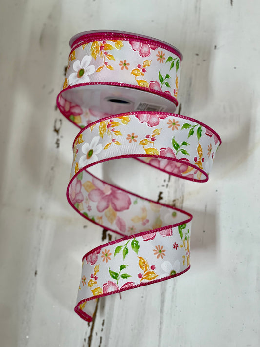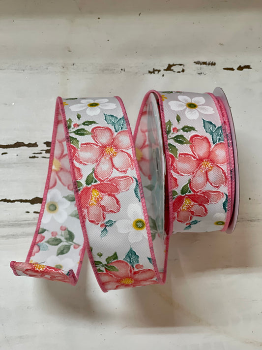 1.5 Inch By 10 Yard White Background With Pink Watercolor Flower Ribbon
