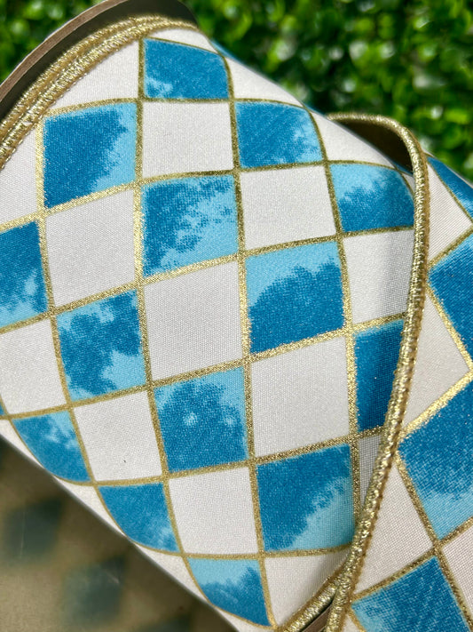 4 Inch By 10 Yards Cobalt Blue And White Harlequin Diamond Gilded Wired Ribbon