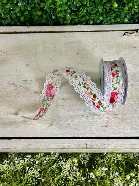1.5 Inch By 10 Yard Red And Pink Mini Roses And Lace Ribbon