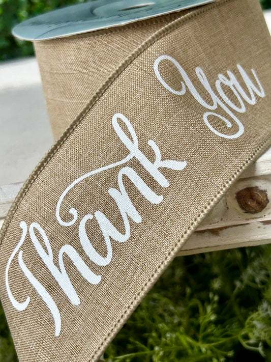 2.5 Inch By 10 Yard Light Beige And White Thank You On Royal Ribbon