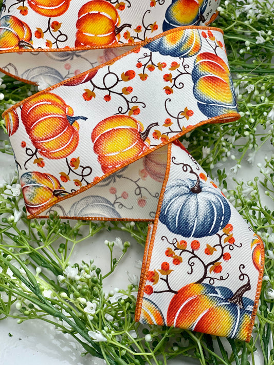 2.5 Inch Ivory With Orange And Blue Pumpkins Ribbon