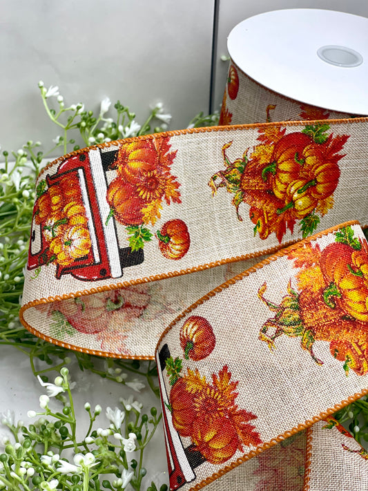 2.5 Inch Natural Ribbon With Pumpkins And Red Trucks