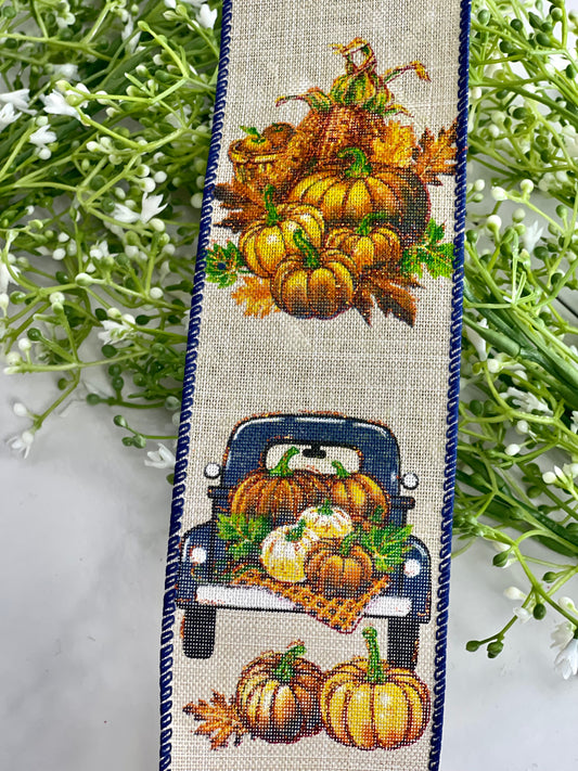 2.5 Inch Natural Ribbon With Pumpkins And Blue Trucks