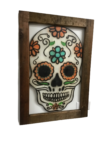 Sugar Skull Skeleton Metal In Wood Frame Teal Dress