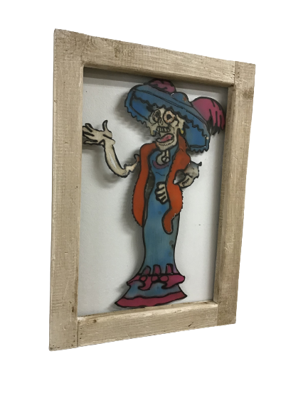 Sugar Skull Skeleton Metal In Wood Frame- Purple Dress
