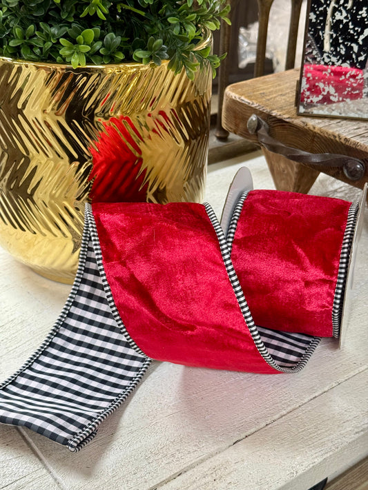 4 Inch By 5 Yards Red Plush Velvet With Black And White Gingham Back Ribbon
