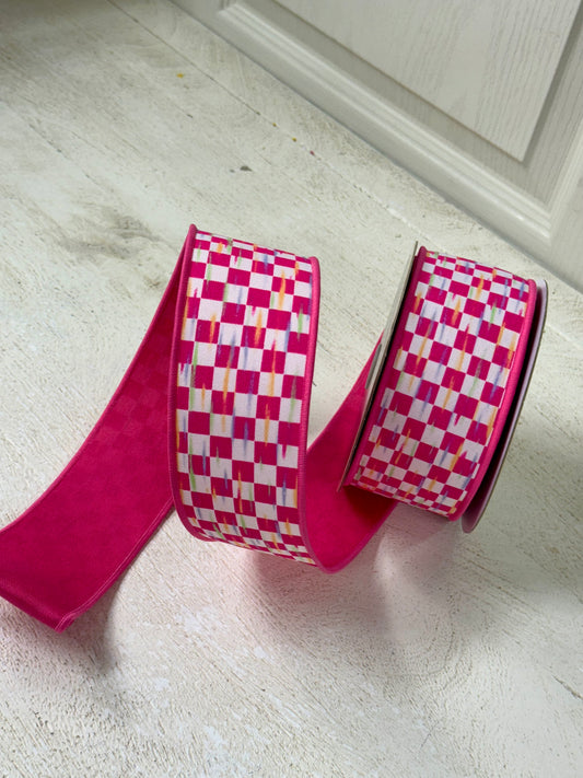 2.5 Inch By 10 Yard White And Hot Pink Mini Antique Checkerboard Fused Ribbon