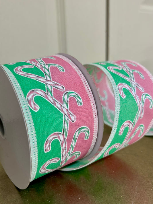2.5 Inch By 10 Yard Mint Pink White Iridescent Glitter Candy Cane Ribbon
