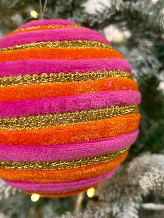 5 Inch Hot Pink Orange Gold Velvet Braided Striped Ornament Ball
