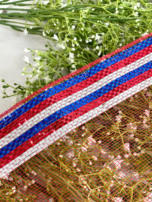 10 Inch By 10 Yard Red White And Blue Border Stripe Metallic Netting