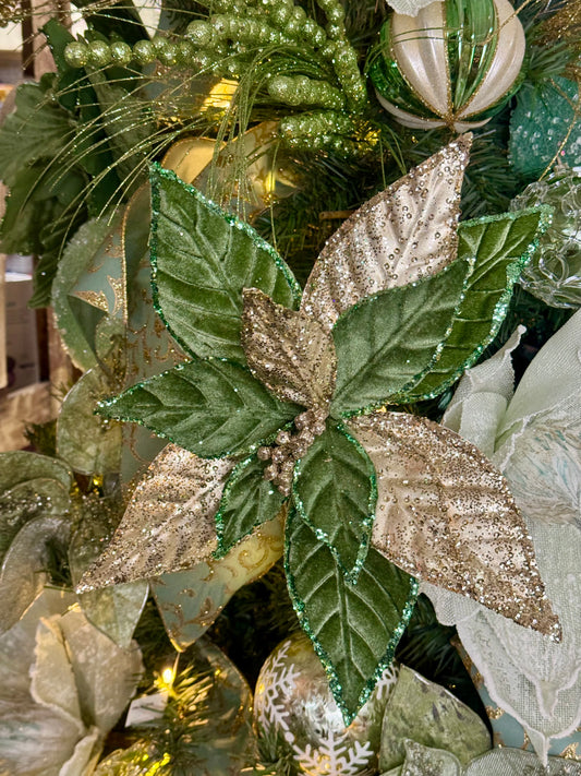 12 Inch Sage Green And Champagne Metallic Velvet Poinsettia Spray