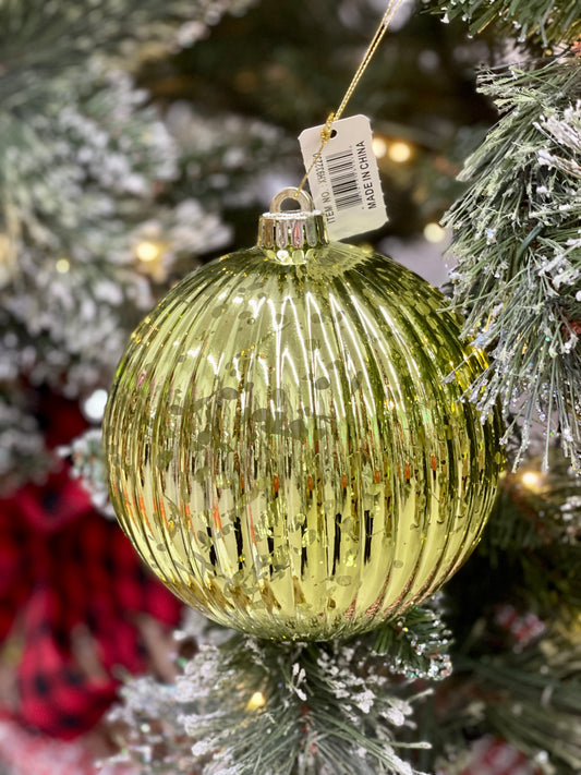 4 Inch Antique Look Shiny Lime Green Vertical Striped Ornament Ball