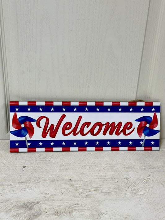 15 Inch Long Red White And Blue Welcome Pinwheel Wooden Sign