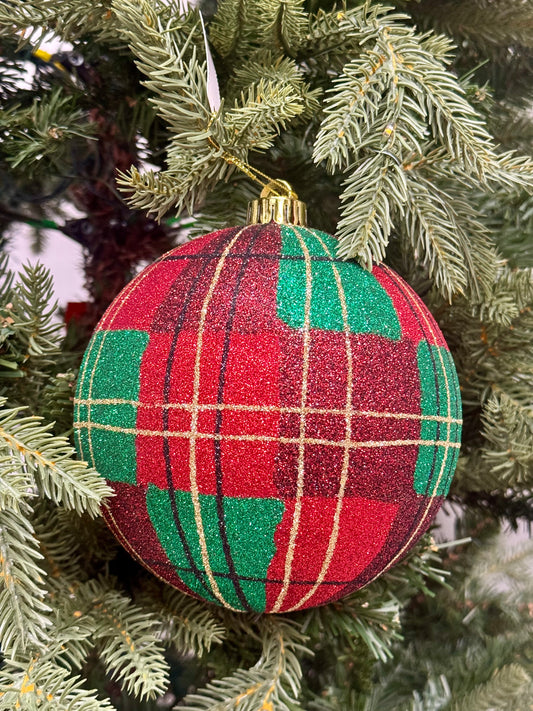 6 Inch Traditional Christmas Plaid Glitter Ornament Ball
