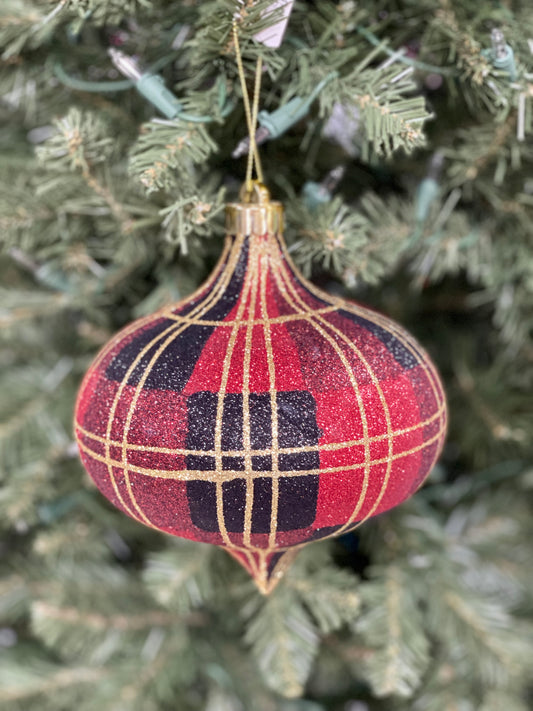 6 Inch Red Black And Gold Plaid Onion Shaped Ornament