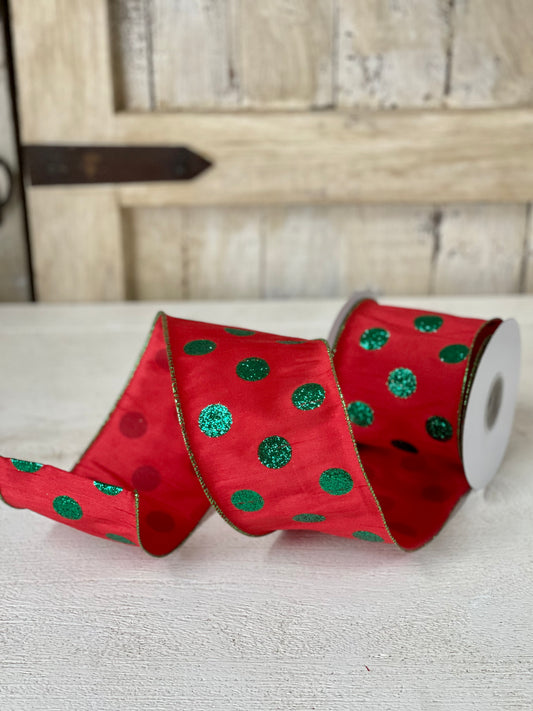 4 Inch By 10 Yard Red Dupioni With Green Glitter Polka Dots Ribbon