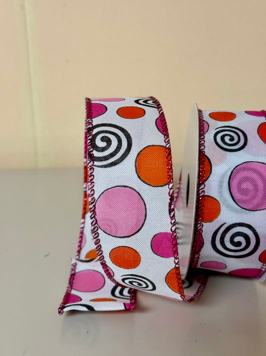 1.5 Inch By 10 Yard Orange And Pink Polka Dots With Black Swirls Ribbon