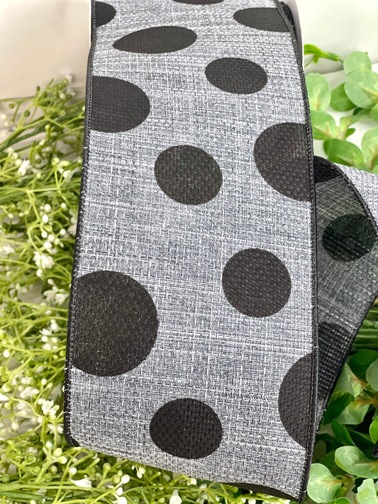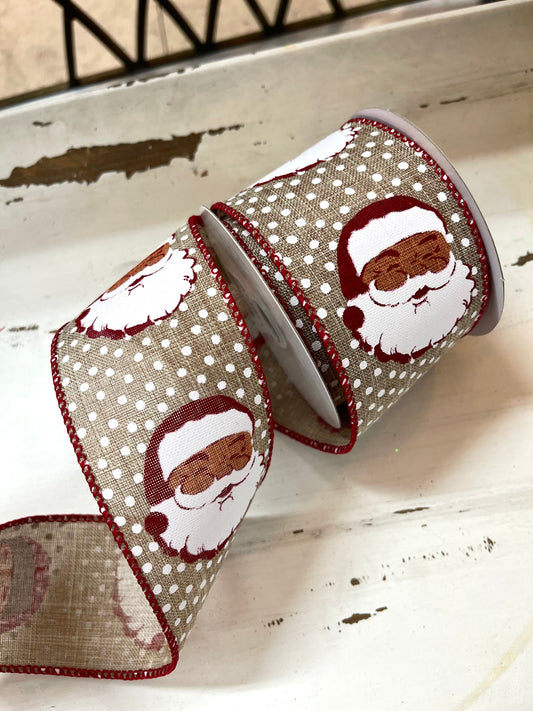 2.5 Inch Natural Linen Santa Face Polka Dot Ribbon