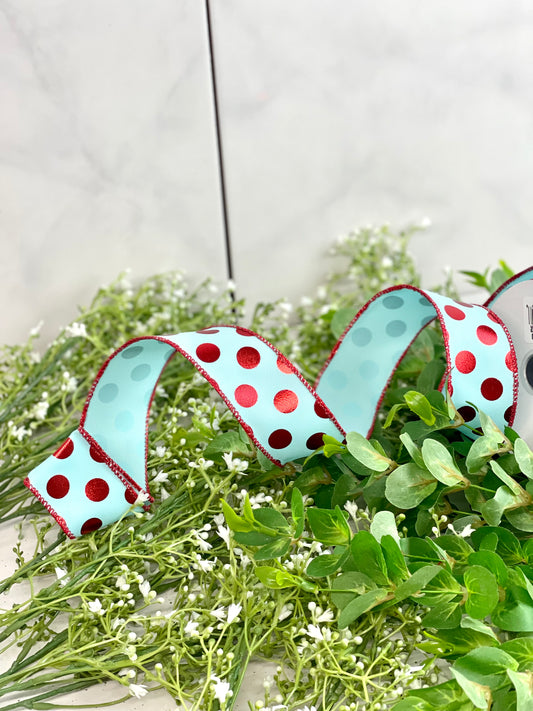 1.5 Inch By 10 Yard Ice Blue And Red Metallic Polka Dot Ribbon