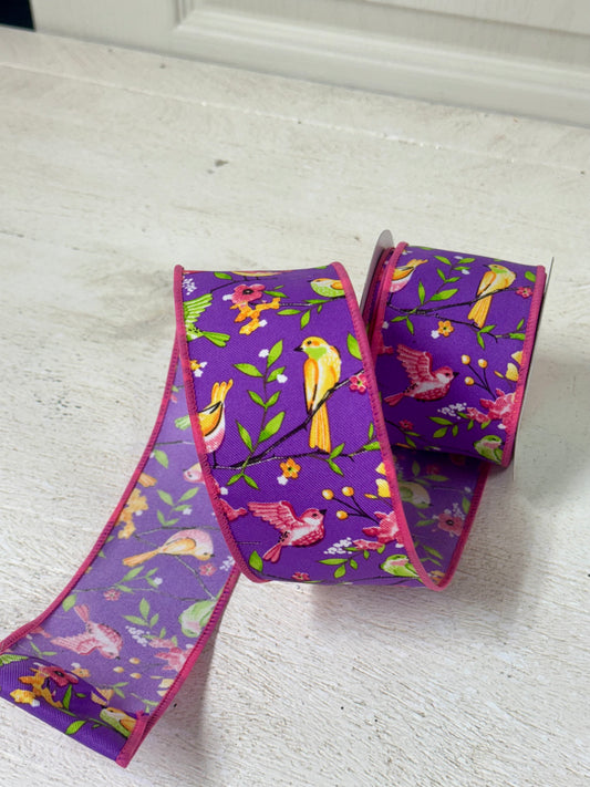2.5 Inch By 10 Yard Purple Birds With Floral Branches Ribbon