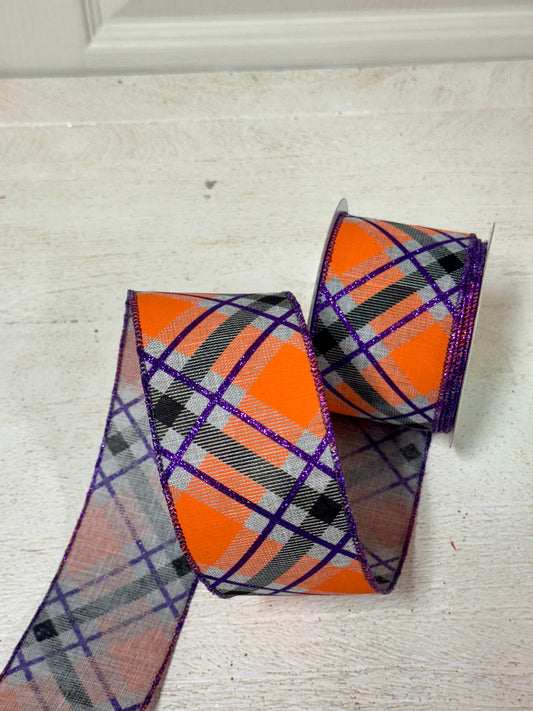 2.5 Inch By 10 Yard Light Grey Purple Orange Diagonal Plaid Ribbon