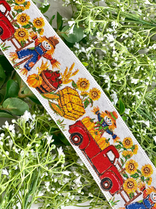 2.5 Inch By 10 Yards Scarecrow In Red Truck With Sunflowers Ribbon