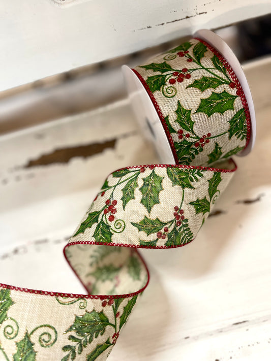 2.5 Inch Gold Glittered Holly Berries On Natural Background Ribbon
