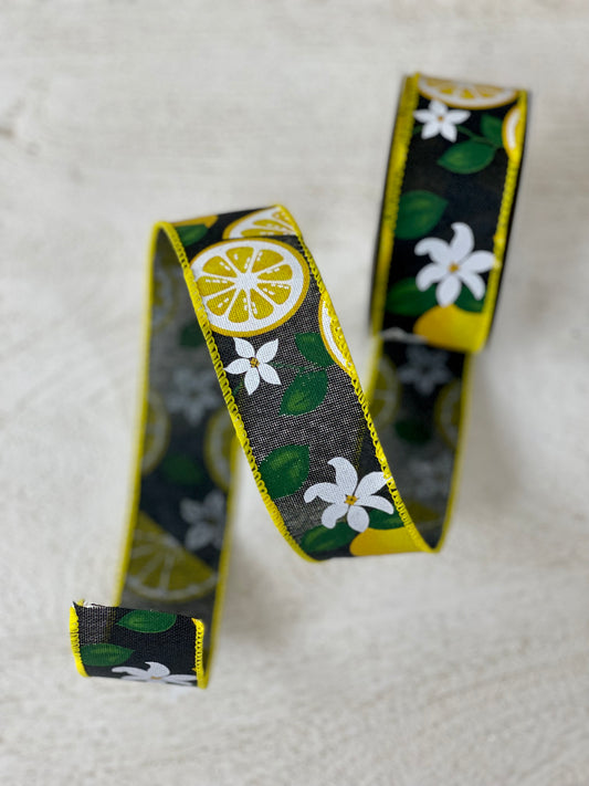 1.5 Inch By 10 Yards Black Linen With Lemons And Flowers Ribbon